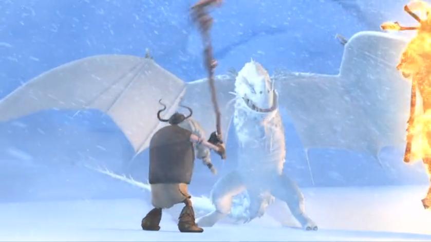 Hiccup told Toothless to fire at the dragon but not at "the crazy little woman with the staff." Toothless fired three multiple blasts at the Snow Wraith, which made it throw Gothi away. Soon after, the dragons broke out and the Snow Wraith was outnumbered by five dragons to one. The Snow Wraith panicked and flew away. Gothi showed them that there was a Snow Wraith tooth implanted on her staff. They then flew back to Berk with the Snow Wraith tooth.